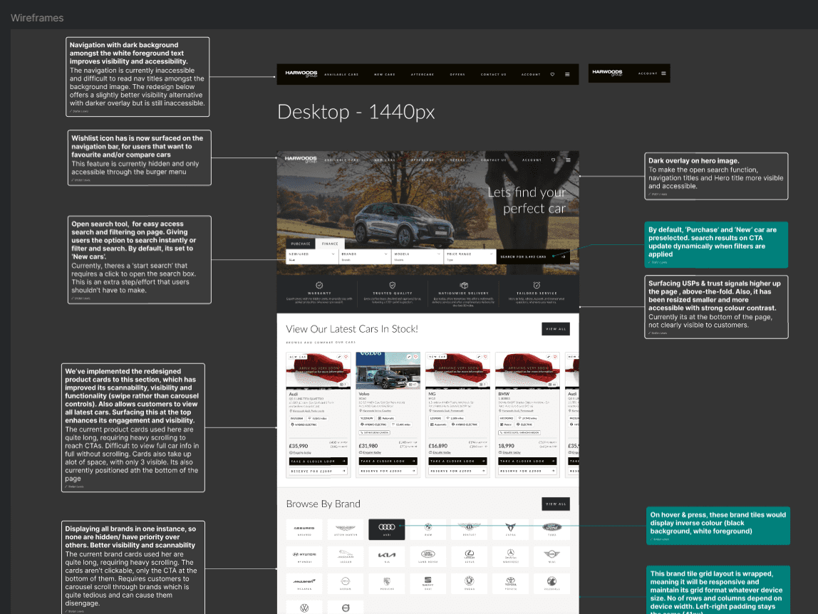 For users arriving with high purchase intent, this made it harder to quickly browse cars, understand Harwoods value proposition, or locate service and repair options.