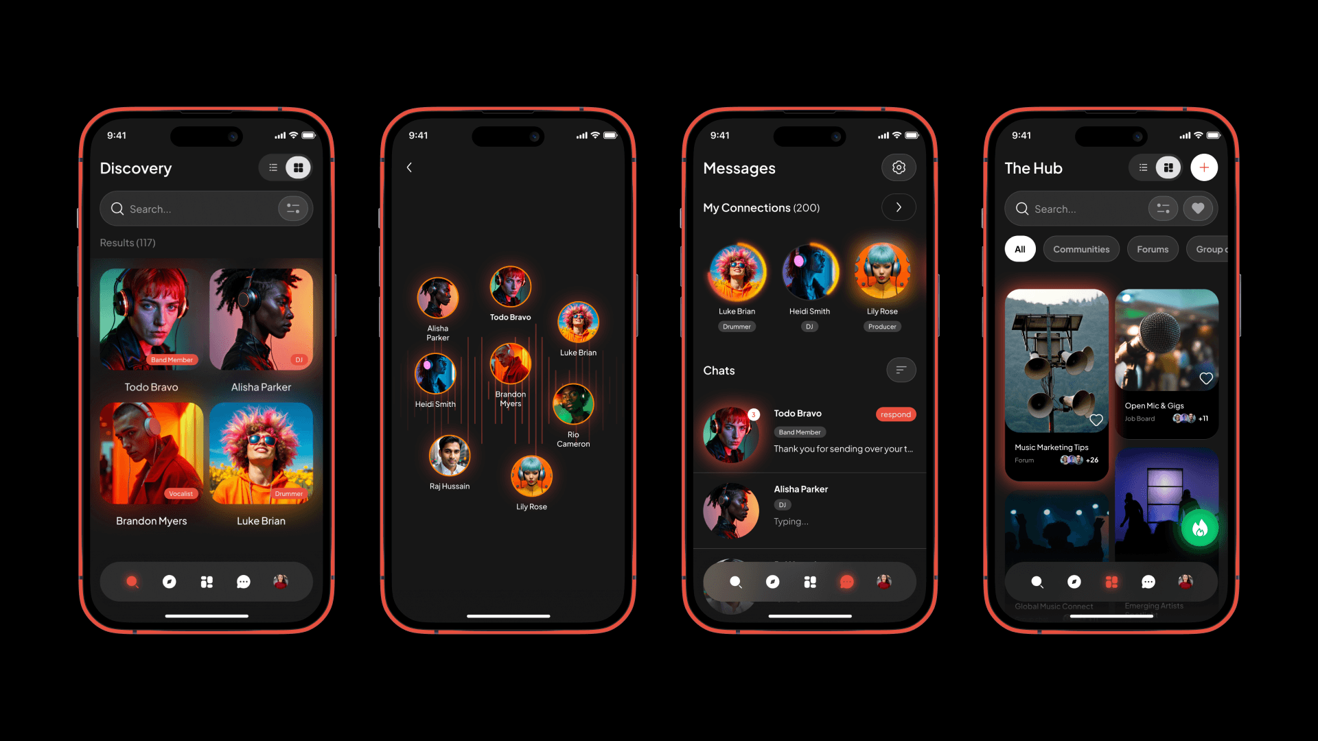 Here are 4 key screens on EXHO: Discovery, Instant connect, Messages, and The hub: