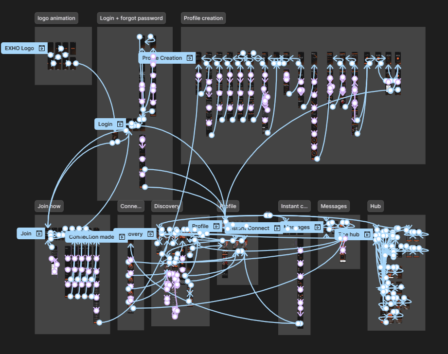 Below is a snapshot of the app prototype in Figma, split into 10 key user journeys that interconnect: